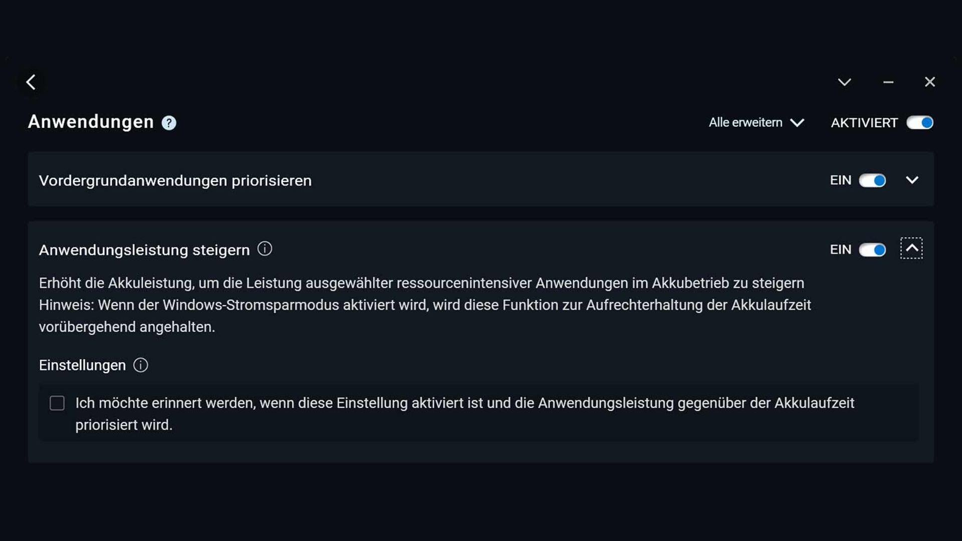 Der Dell Optimizer sorgt mit den Anwendungseinstellungen dafür, dass trotz Akkubetrieb die Leistung nach oben geschaltet wird – auch wenn dann die Akkukapazität schneller in den Keller geht.