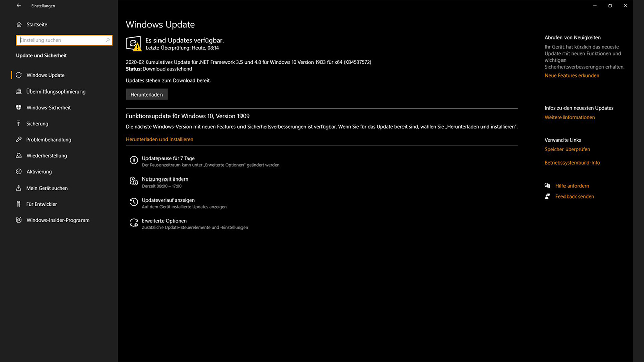 Über die Sicherheitseinstellungen von Windows lassen sich alle vom System getätigten Updates überprüfen und auf Wunsch auch neu anstoßen oder pausieren.