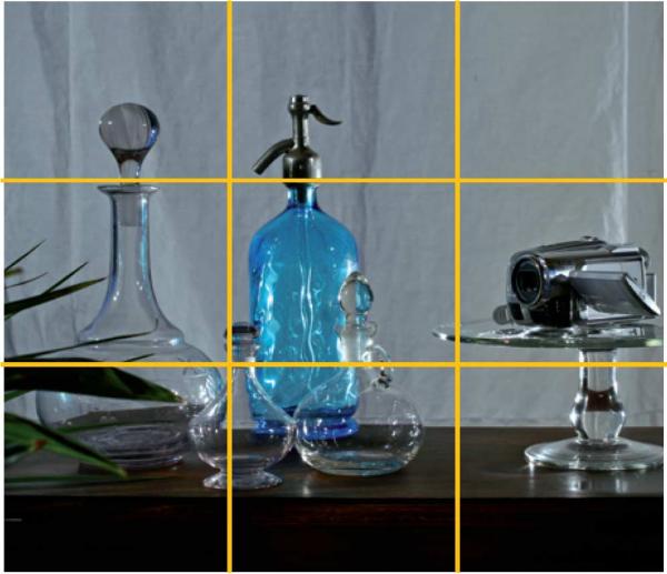 Das bedeutet in der vereinfachten Form: Nehmen Sie zwei Schnittpunkte, an denen eine gedachte horizontale Linie und eine gedachte vertikale Linie sich schneiden. Beide sollten in einer Entfernung von 1/3 zu 2/3 der Seitenlänge durchs Bild laufen (siehe „Gitter" im Foto rechts). Vier solcher Stellen gibt es im Bild – nehmen Sie die Diagonale, welche, ist egal. Haben Sie nur ein Objekt, postieren Sie es nicht zentral, vor allem nicht bei 16:9-Aufnahmen. Das wirkt langweilig. Auch hier ist rund ein Drittel zum Rand hin optimal. Alles arrangiert? Prima. Jetzt Licht setzen. Sie brauchen drei Lampen: im Freien die Sonne und zwei gute Reflektoren, in Innenräumen drei Glühlampen, je stärker, desto besser. Oder Sie kaufen drei Dauerlicht-Strahler mit Tageslicht- Leuchtmittel. Das ist professionell, aber teuer.