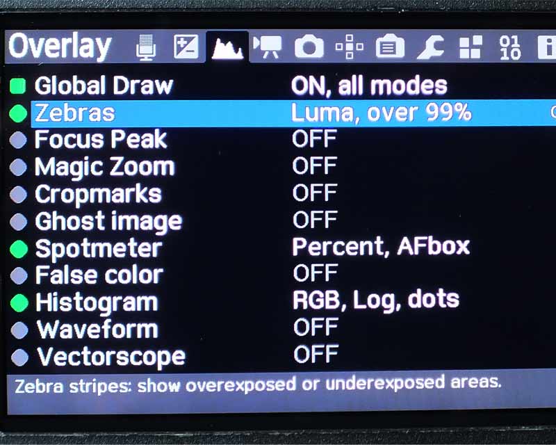 Es ist ja schön, neue Funktionen zu finden, doch mindestens genauso wichtig ist es, das Bild auf dem kleinen Monitor besser kontrollieren zu können: Ein Histogramm visualisiert die Kontrastverteilung in einem Bild, es zeigt nicht, wo sich die unterbelichteten Stellen befinden. Das kann ein Waveform-Diagramm. Canon selbst hat das Histogramm nur beim Einstellen und nicht bei der Aufnahme. Erst Magic Lantern bietet viele dieser Belichtungshilfen. Es stellte sich aber heraus, dass die Anzeigen nicht hundertprozentig verlässlich sind: Sie ruckeln oder fallen bisweilen aus, wenn mehrere Funktionen gleichzeitig genutzt werden.