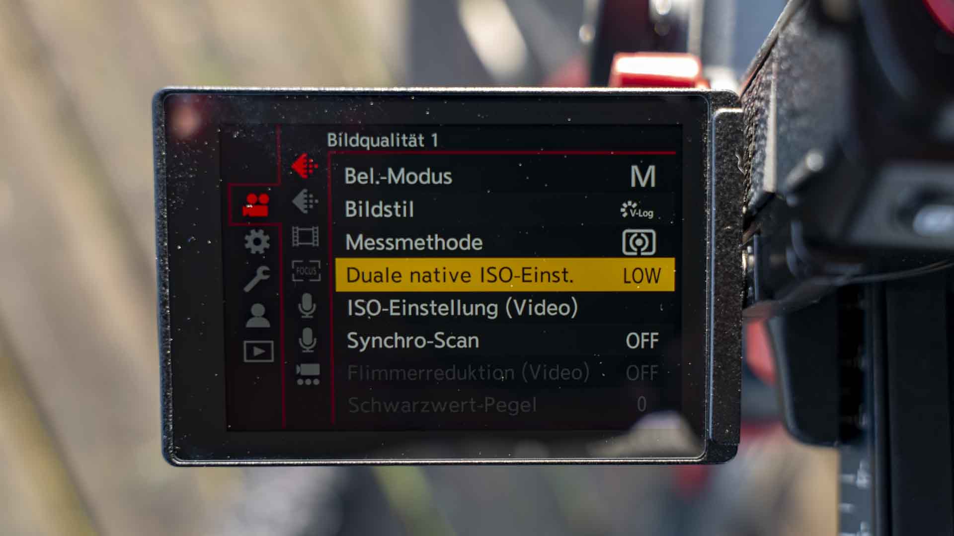 Die S5II erlaubt die manuelle Auswahl der zwei nativen ISO-Empfindlichkeiten, bietet aber auch weiterhin die automatische Umschaltung. Im V-Log-Modus liegen die zwei Empfindlichkeiten bei ISO 640 und 40000, im Standard-Modus bei ISO 100 und 640.
