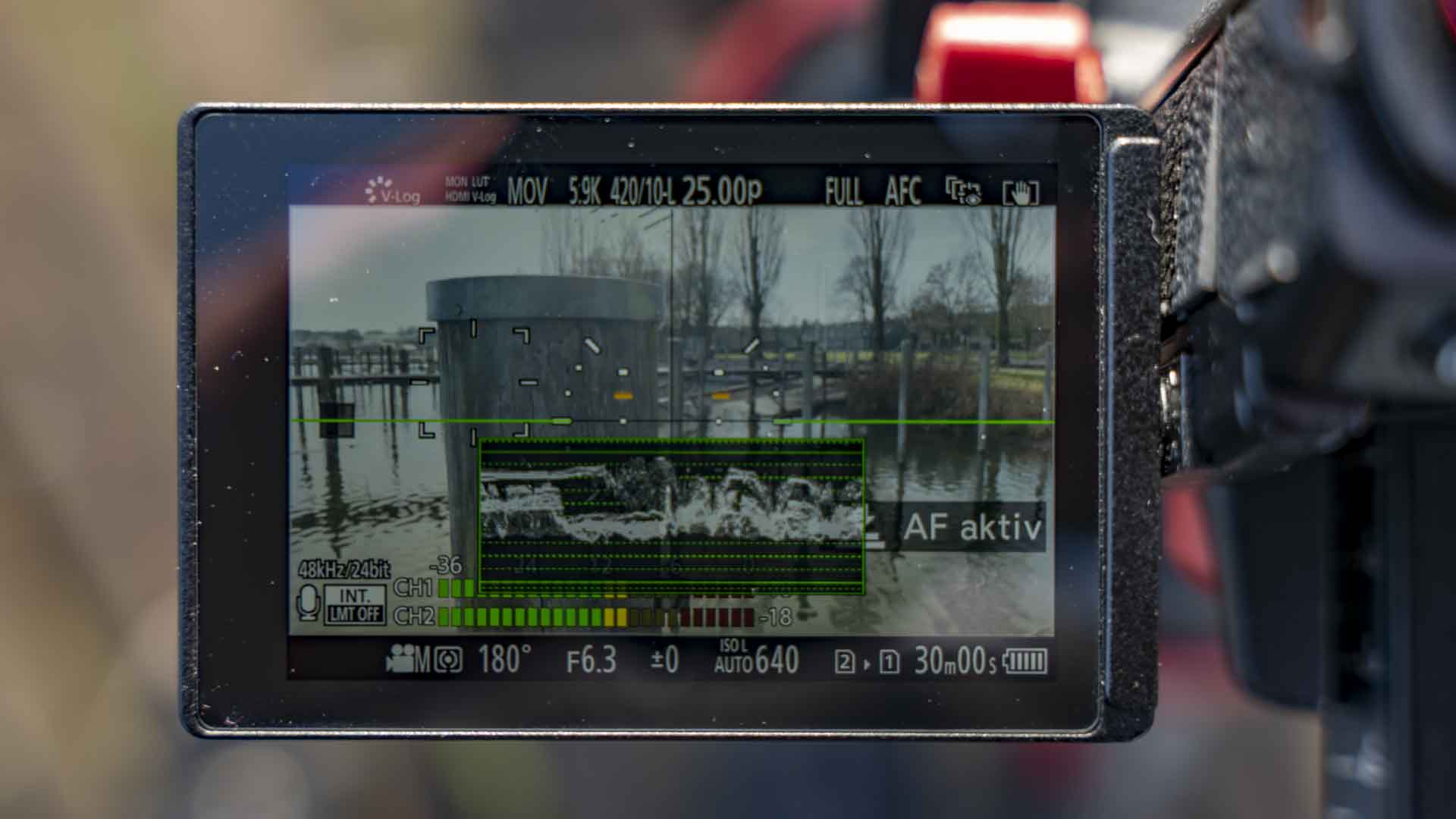 Panasonic hat die üblichen Hilfswerkzeuge integriert, doch lässt nur eines von den drei Werkzeugen für Histogramm, Waveform oder Vectorskope aktivieren. Zumindest bei der Waveform-Darstellung wird der Platz auf dem Monitor sehr eng.
