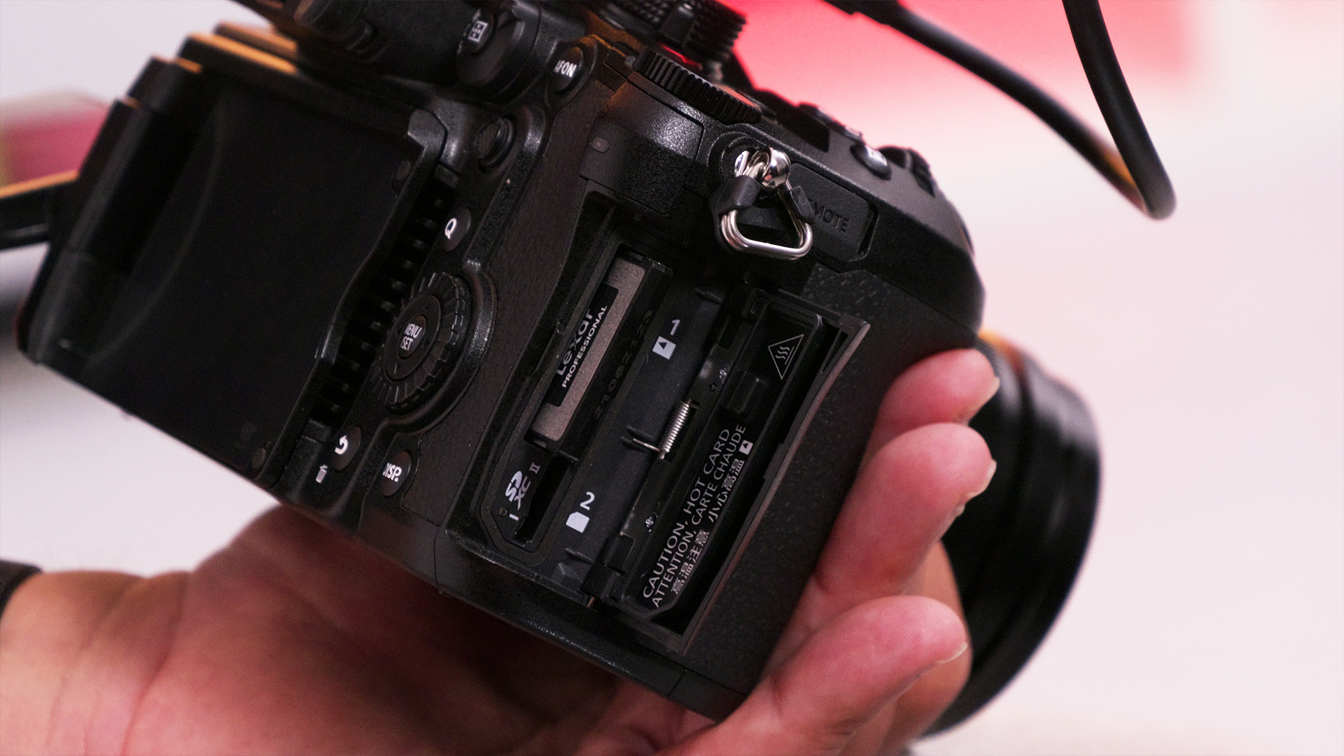 Die GH7 nimmt sowohl SDXC- als auch CFexpress-Typ-B-Karten auf. Gleichzeitige Aufnahme auf beiden Speichermedien sind dadurch nur bei geringen Datenraten möglich.