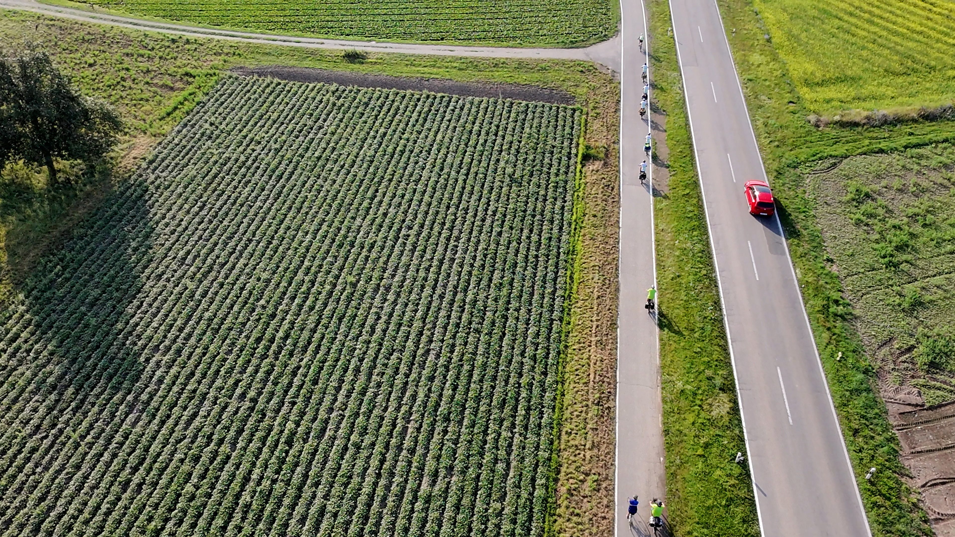 Schauen Sie in unserem Video in die feinen Strukturen wie hier im Feld links neben dem Radweg. Hier tauchen immer wieder kurze Moiré-Effekte auf. Die Fluggeschwindigkeit reicht übrigens für die Radfahrer kaum aus, weshalb diese irgendwann aus dem Blickfeld verschwinden.