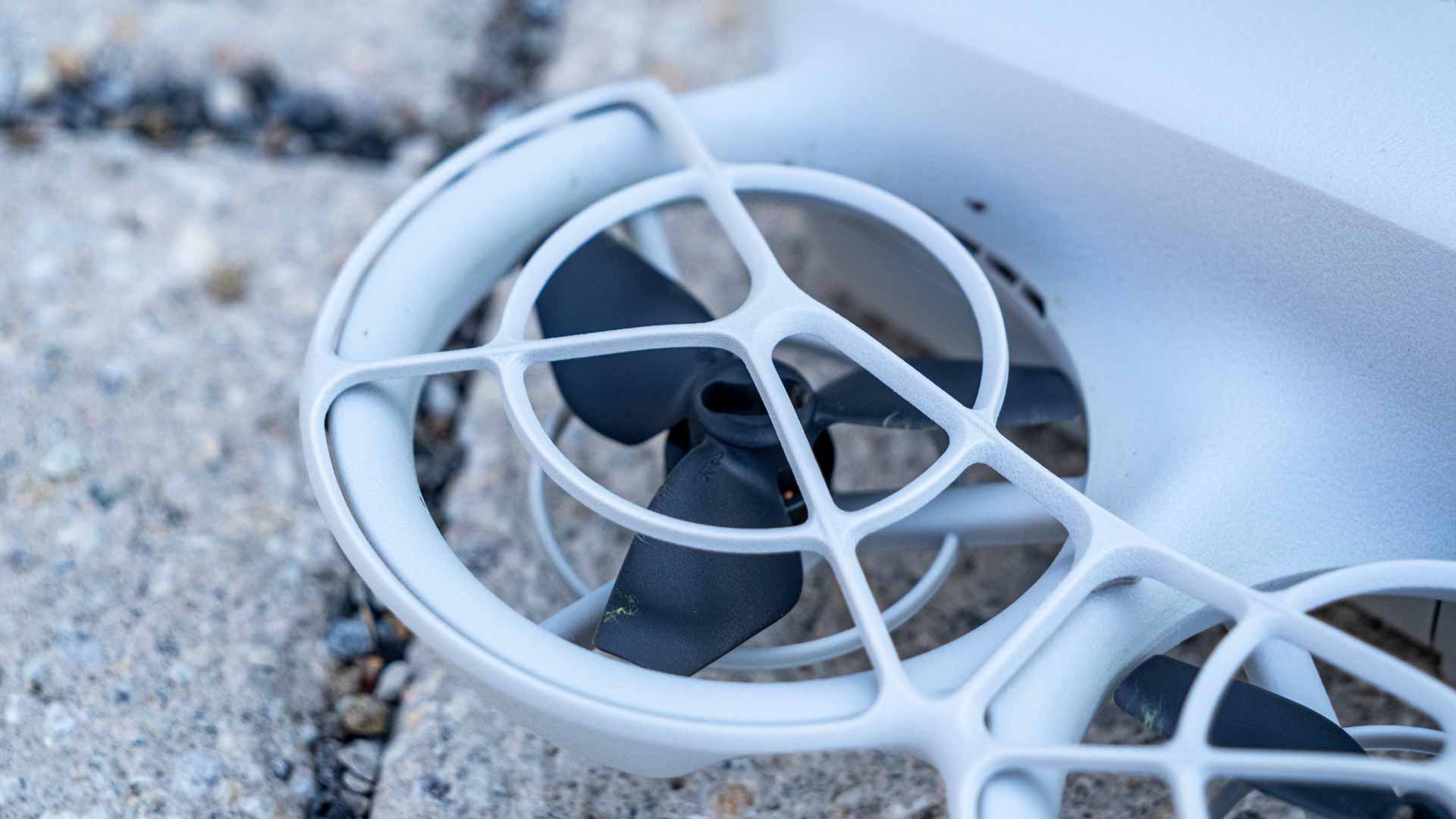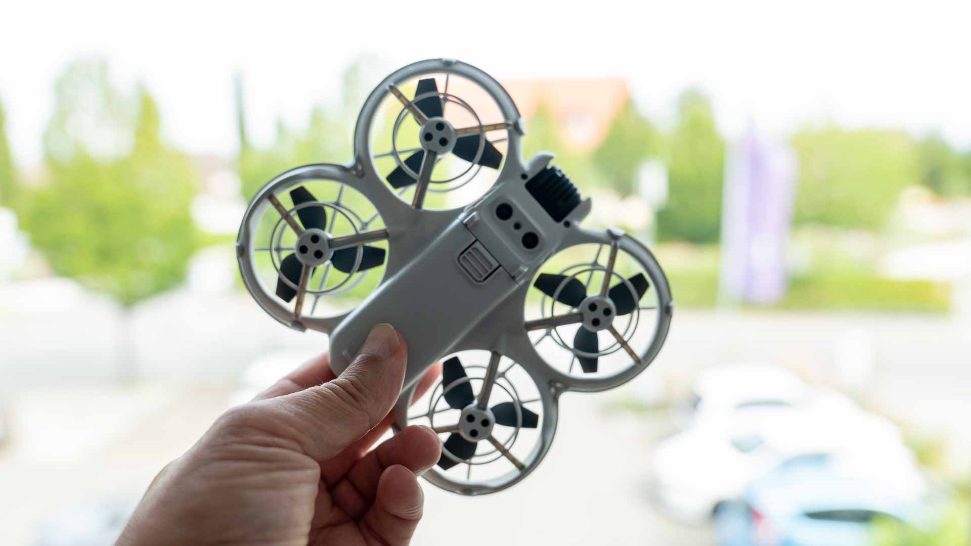 Die DJI Neo erinnert auf den ersten Blick an die (bereits getestete) Avata 2– doch tatsächlich ist sie deutlich kleiner und leichter. Aber sie hat eben auch in einem Käfig befindliche Propeller, welcher im Gegensatz zur FPV-Drohne die Propeller nicht nur seitlich, sondern auch von unten und oben umgibt. Den oberen Schutz kann man zwar abnehmen, was zu einer geringfügig längeren Flugzeit führt und sie etwas leiser macht, aber ansonsten nicht wirklich sinnvoll ist. Denn Sensoren hat die Drohne nur auf der Unterseite, damit sie den Abstand zum Boden abschätzen kann. Ansonsten fliegt die Drohne dort hin, wohin man sie steuert – im Extremfall also auch an die Wand oder in Bäume. Gerade bei letzterem ist der obere Käfig durchaus sinnvoll, denn sonst bleibt die Neo all zu leicht in luftiger Höhe in Ästen hängen, was sie schwer zu bergen macht. Ansonsten kommt die Drohne eben recht schnell runter, denn bei einer Kollision schaltet die Drohne die Propeller ab. Die Propellerkäfige dienen dann dem Schutz des Flugkörpers und der Gimbal-Kamera. Inwieweit ein Absturz dann tatsächlich folgenlos bleibt, dürfte eher dem Zufall respektive der Flughöhe überlassen sein.