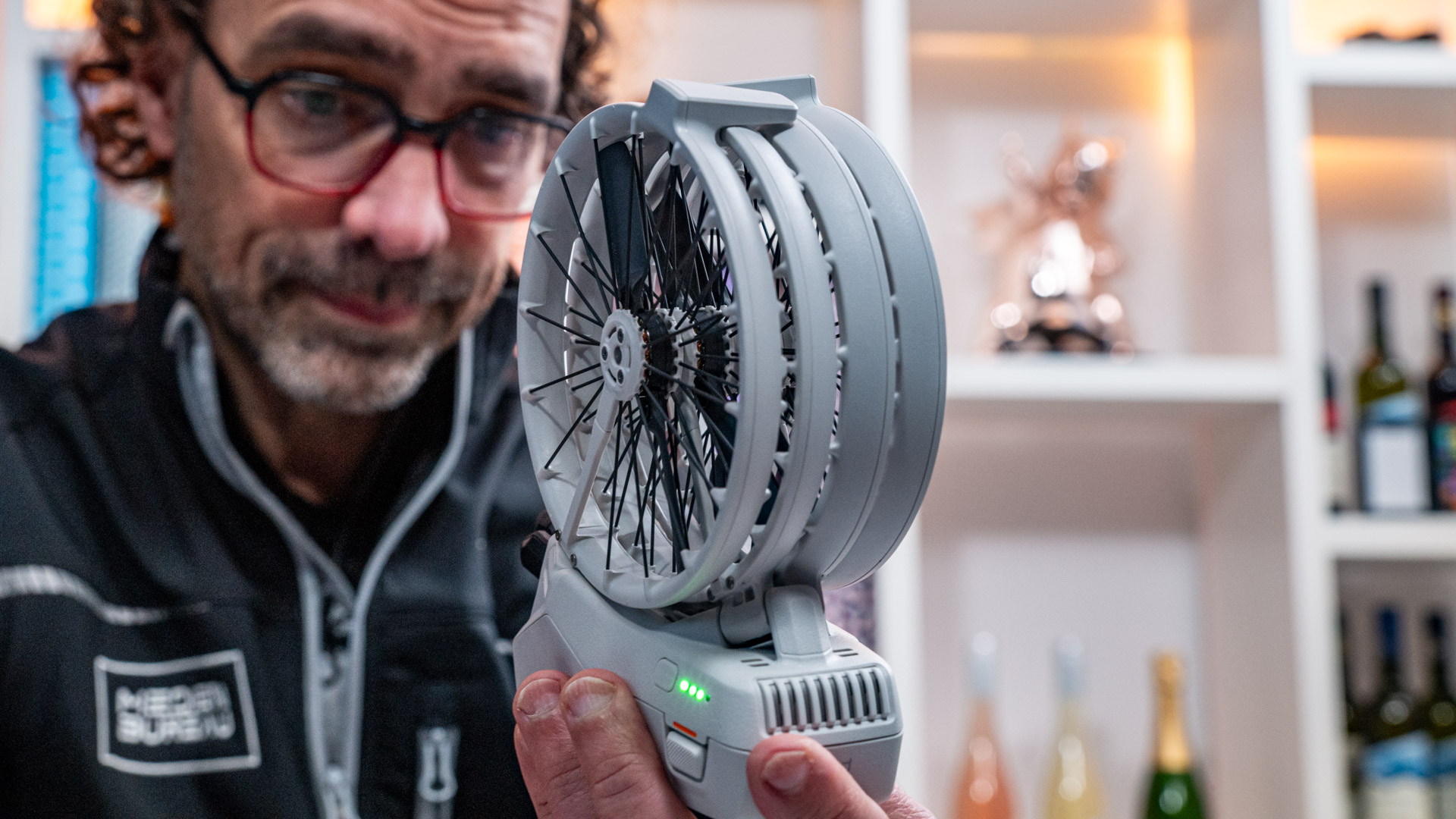 Der Klappmechanismus ist sehr gut überlegt und erlaubt größere Rotoren, die somit langsamer und leider drehen. Dennoch ist die DJI Flip sehr kompakt.