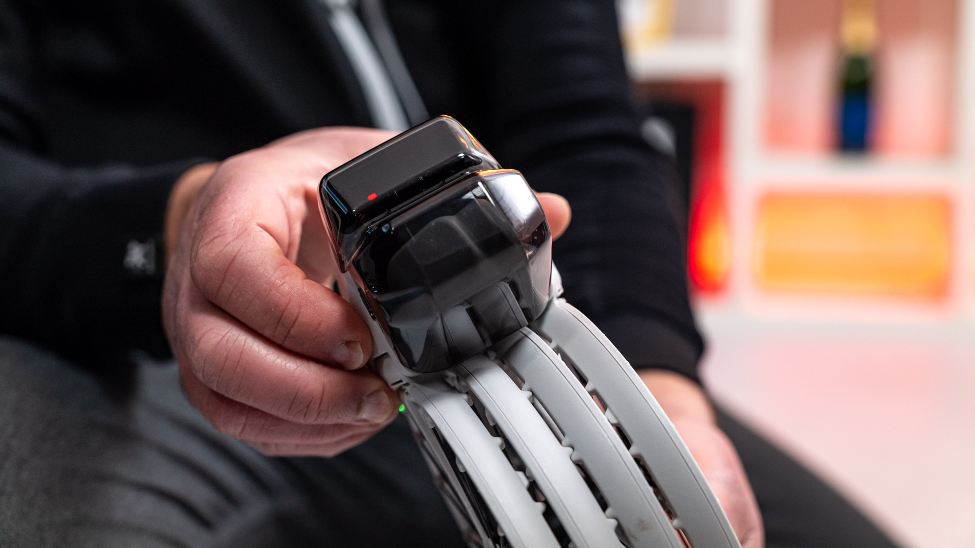 Der Akku klinkt sicher in die Drohne ein und liefert zuverlässig den Saft für fast 30 Minuten Flugzeit. Der Einschalter sitzt seitlich am Gehäuse neben den vier LEDs, die den Ladezustand des Akkus anzeigen.