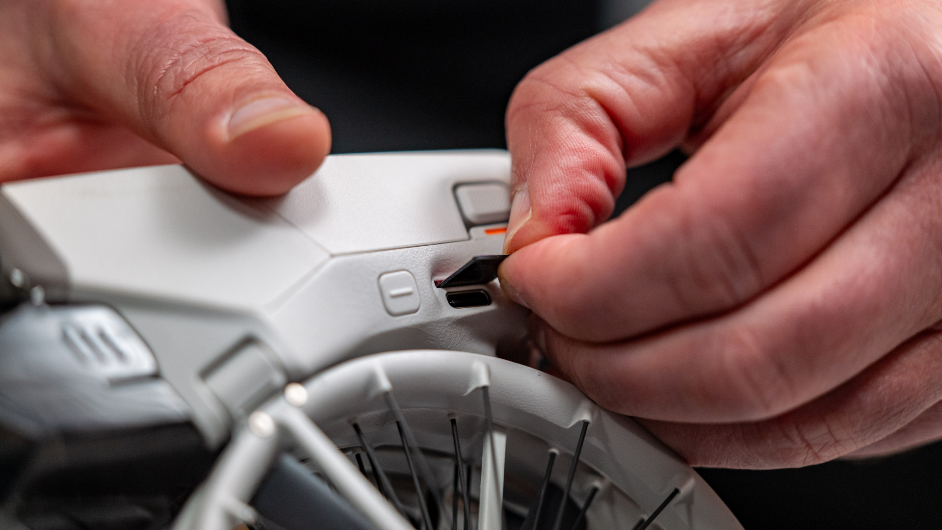 DJI integriert in die Flip wieder ein Speicherkartenlaufwerk, was wir von der Handhabung her dem internen Speicher vorziehen. Ist der Speicher voll, kann man einfach eine neue Karte einlegen und weiterfliegen, anstatt den internen Speicher auslesen zu müssen.