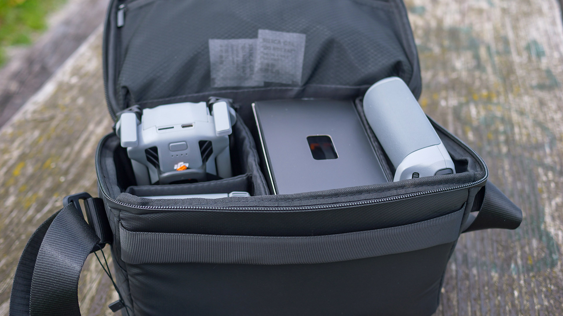 Im Gegensatz zur Flip ist die Mini 5 Pro, nach wie vor leichter als 250 Gramm, ganz „klassisch“ mit ausklappbaren Rotorarmen aufgebaut. Zusammengeklappt etwa handflächengroß, liegt über Kamera und Gimbal ein überstulpbarer Plastikschutz. Dessen Montage ist etwas hakelig, da die Rotoren zum sicheren Transport in kleinen Aussparungen Platz finden sollen, die gleichzeitige Platzierung aller vier Rotoren aber einiges an Koordination erfordert. Am Ende aber wie so oft Gewöhnungssache. Positiv ist hingegen, dass die Tasche der Fly More Combo an Größe zugelegt hat, so dass Drohne, RC-2-Fernbedienung, Ladestation und Ersatzteile gleichzeitig bequem Platz darin finden. Die Kamera selbst nimmt inzwischen einiges an Raum ein, was auch am entsprechend größer geratenen Gimbal liegt.