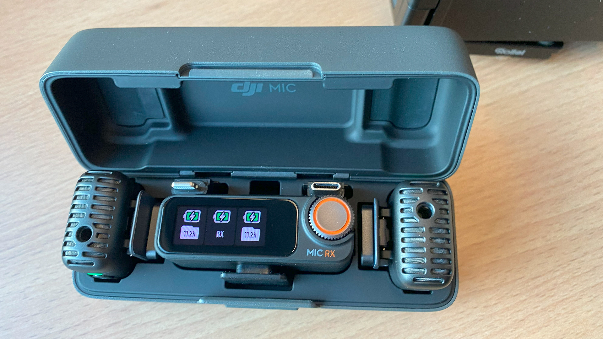 Auf den ersten Blick ist die das DJI Mic 2 nicht neu, denn auch wenn die Gehäuseabmessungen leicht anders sind, bleibt es bei der kompakten Bausweise mit kleinem Display am Empfänger und zwei Sendern mit integriertem Mikrofon, die sich direkt ans Revers heften lassen. Die Verbindung nehmen Sender und Empfänger direkt nach dem Entnehmen aus der praktischen Ladeschale auf. Diese beinhaltet einen Akku, mit dem sich die Funkstrecke circa drei mal aufladen lässt, so dass sie sich problemlos über einen Drehtag hinweg nutzen lässt – wenn man die Drehpausen zum nachladen nutzt. Wenn auch schon länger bekannt, ist es doch recht schick, dass das Display am Empfänger in der Ladeschale zur Statusanzeige wird. In der Ladeschale findet man zudem zwei Stecker, mit denen der Sender direkt an Andoid (USB-C) oder Apple Smartphones (Lightning) angesteckt werden kann. Die Ladeschale wiederum passt in die relativ voluminöse Tasche, in der dann zudem noch die Windfelle sowie unser optional mitgeordertes Lavalier-Mikrofon sowie das Verbindungskabel zur Kamera Platz findet.