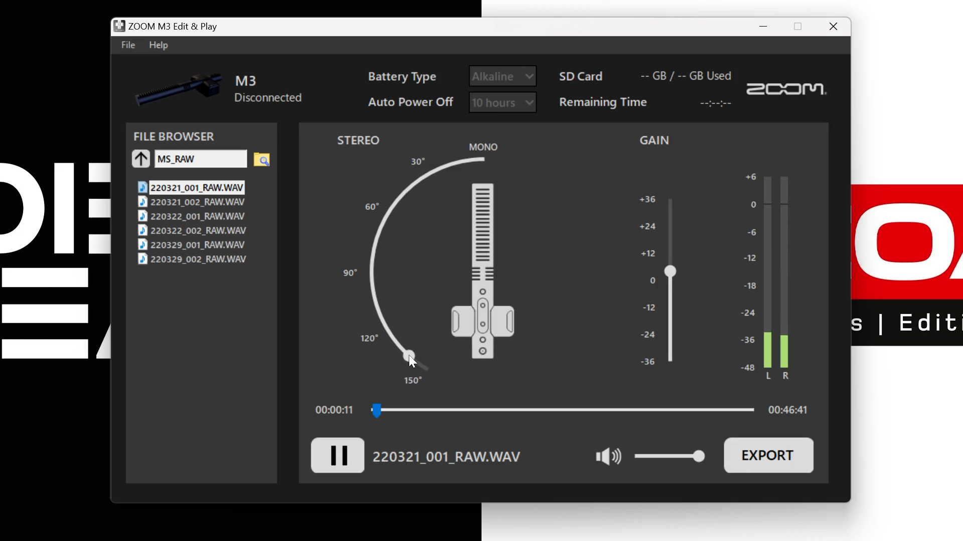 Ein Trick bei der Mitte-Seite-Aufnahme ist, dass das Verhältnis von Seiten- und Mittensignal nachträglich verändert werden kann. Dazu zeichnet das M3 MicTrak RAW-Dateien im Waveform-Format auf und stellt mit der Zoom M3 Edit&Play-Software die entsprechende Nachbearbeitungsmöglichkeit zur Verfügung. Dazu verbindet man das Mikrofon via USB-C mit dem Schnittrechner und aktiviert durch gleichzeitiges Drücken von Anschalter und Stereo-Taste die Datenübertragung. Jetzt kann man den Stereo-Öffnungswinkel einstellen, die Lautstärke einstellen und die Clips anschließend in 24 oder 32 Bit und auf Wunsch normalisiert ausgeben.
