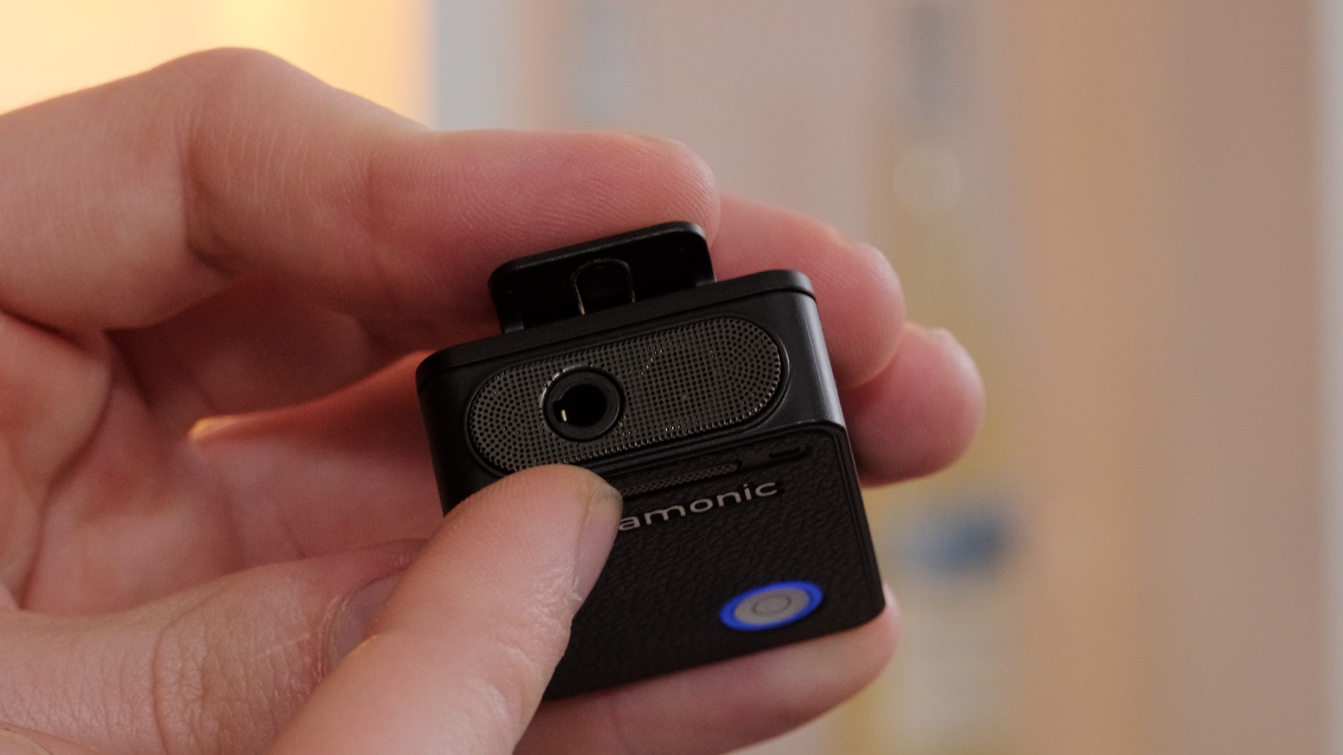 Die Sender sind zwar in schwarz gehalten, jedoch nicht diskreter als die DJI-Konkurrenz. Das liegt nicht an den kleinen, silbernen „Saramonic“-Schriftzug auf der Frontseite, sondern der ebenfalls dort platzierten Status-LED. Auf der anderen Seite sieht man damit im Betrieb sofort den Sender-Status: im Normalfall leuchtet die LED blau, bei aktivierter Noise Reduction grün. Ist der Sender stummgeschaltet, blinkt eine zweite LED in Signalrot. Nehmen die Sender auf, leuchtet diese durchgehend. Mit einem Druck auf den Anschalter aktiviert man die Stummschaltung, zusätzlich gibt es zwei Tasten für Aufnahme und Nebengeräusch-Unterdrückung. Oben am Gehäuse befindet sich nicht nur das interne Mikrofon, sondern auch die TRS-Buchse für das Lavalier-Mikrofon. Diese nimmt auch den im Set enthaltenen Windschutz auf, der dadurch sicher auf dem Sender sitzt. Ein Konzept, was wir nicht nur von DJI, sondern auch vom Comica Vimo Q kennen.