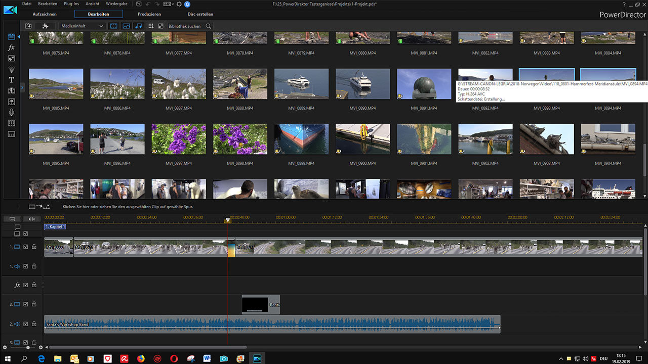 Der Import von Mediendateien gelingt sehr einfach: Mein Rohmaterial stammt von einer Canon Legria GX 10 in Full-HD mit 50p und einer Datenrate von ca. 36 MBit/s. Der PowerDirector bietet dabei eine elegante Lösung an, mit der man einzelne oder mehrere markierte Dateien oder auch einen kompletten Medienordner – wahlweise mit Unterordnern –importieren kann. Von Vorteil ist auch, dass der PowerDirector keine versehentlichen „Doppel-Imports“ gleicher Dateien zulässt. Das Positionieren der Clips auf der Timeline gelingt per Drag and Drop problemlos. Auch beim Einfügen und Entfernen von Clips erhält man in einem sich aufklappenden Pop-up-Fenster exakte Auswahlmöglichkeiten für das „Überschreiben“, „Einfügen“ oder „Einsetzen“ eines Clips.