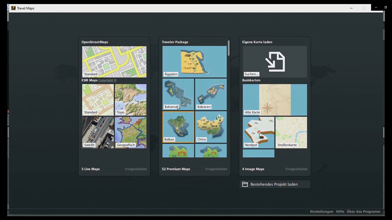 Zu Beginn stellt Magix Travel Maps eine Auswahl von verschiedenen Karten bereit. Neben normalen Straßenkarten und gezeichneten Karten im Cartoon-Look lassen sich auch Satelitenbilder nutzen.
