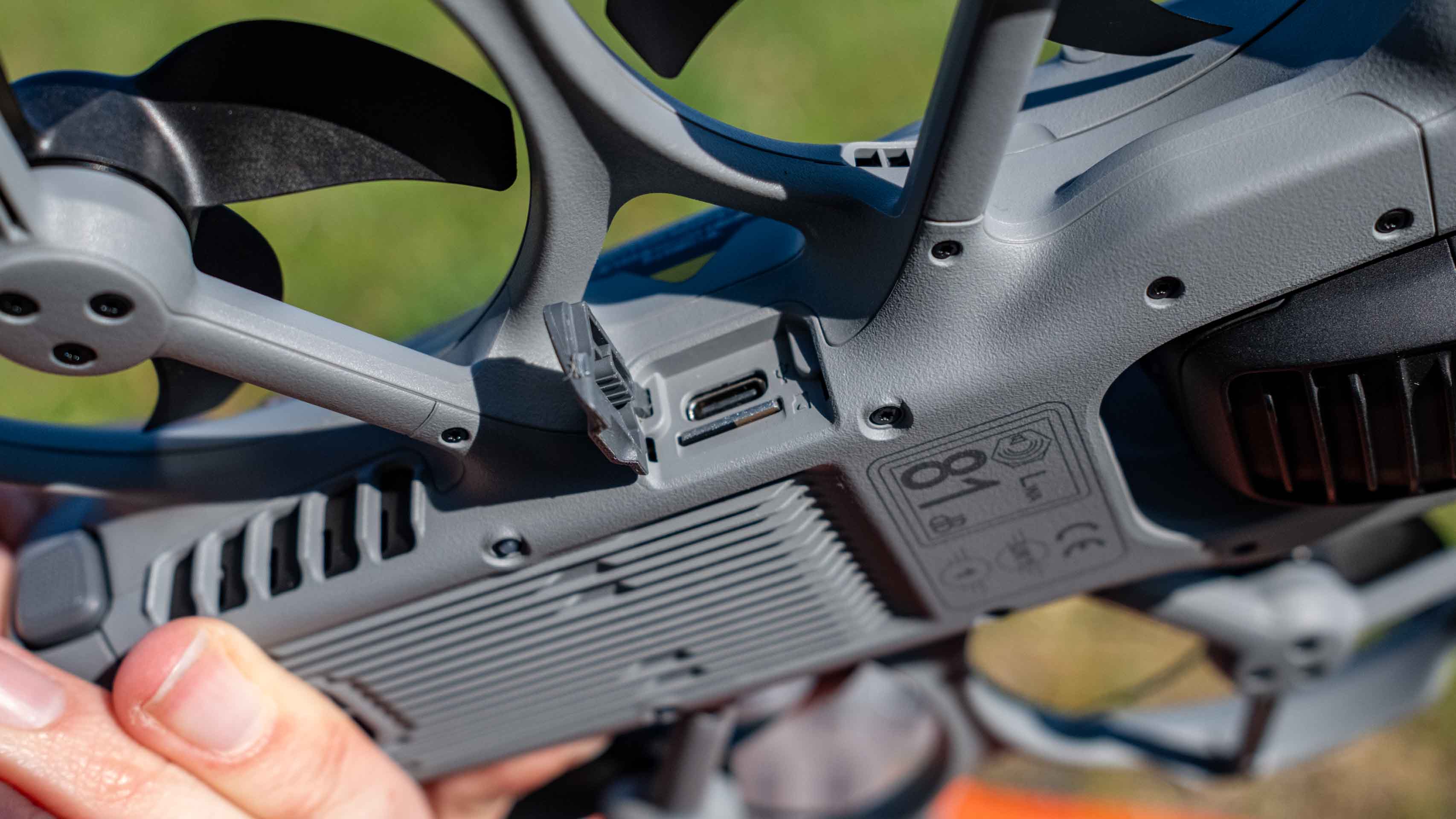 Vor allem gegenüber ihren Avata-Schwestern ist die Avata 360 relativ groß gehalten, was vor allem an der massiven Kamera-Halterung liegt. Diese ist drehbar und bildet mit ihrer gummierten Unterseite einen Teil des Standfußes. Vier Rotoren mit ebenso vielen Blättern sorgen für Auftrieb – wobei diese wieder in einem durch das Gehäuse geschützten Bereich rotieren. Das sorgt dafür, dass die Drohne auch mal „anecken“ kann – zumindest bei langsamen Flugmanövern entsteht so kein Schaden. Dennoch bietet die Drohne Sensoren, die eine Hinderniserkennung nach oben und unten ermöglichen. Außerdem erkennt sie auch Hindernisse im Rückwärtsflug, wahrscheinlich durch die Analyse des Kamerabildes.