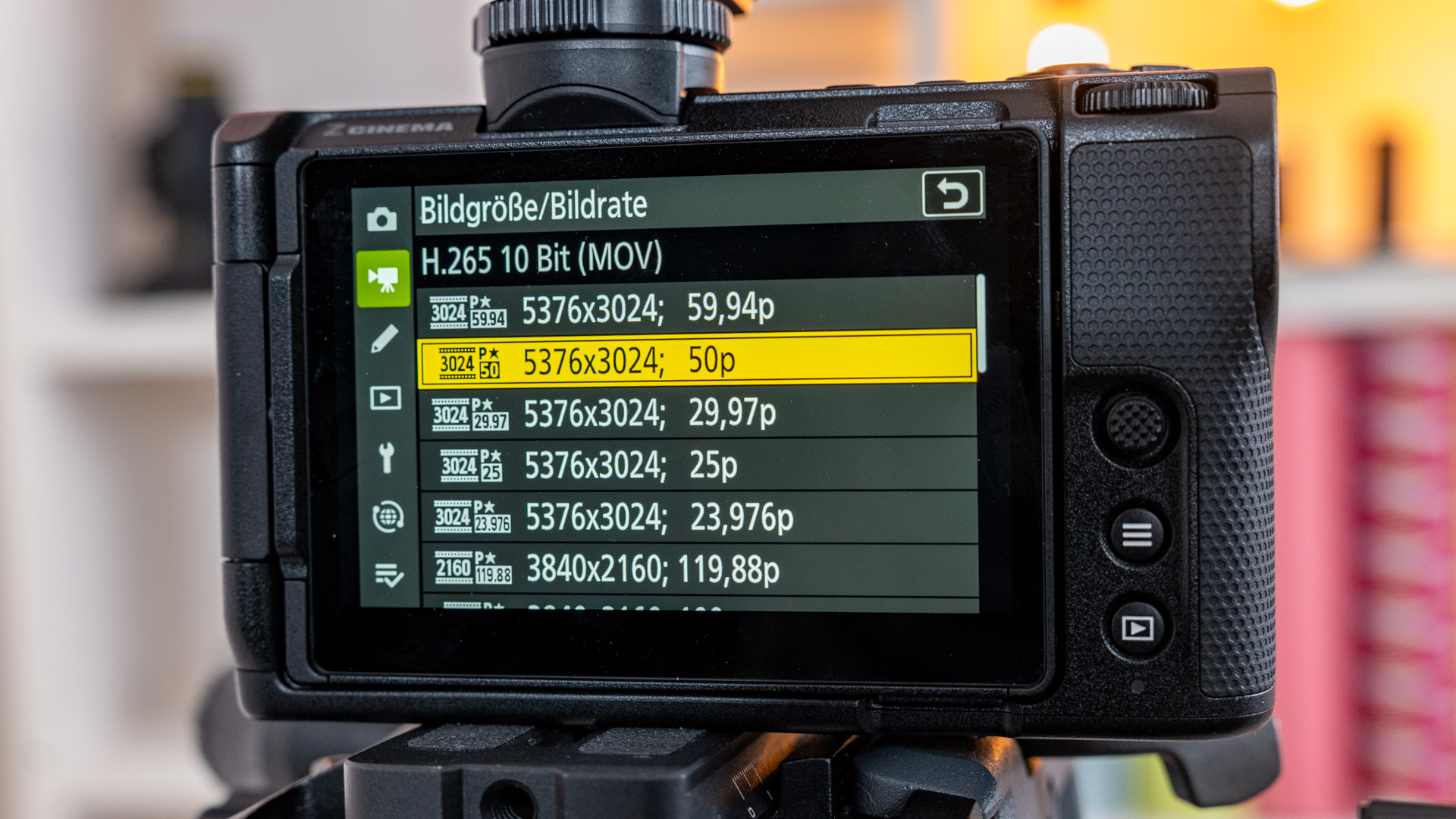 Dank „partially stacked“-Bauweise ist ein schnelles Auslesen möglich, was hohe Bildraten erlaubt: 6K mit 60p, 4K mit 120p und Full HD bis 240p. Der Dynamikumfang liegt laut Herstellerangabe bei über 15 Blendenstufen. Das erscheint nach dem Betrachten der ersten Aufnahmen durchaus realistisch – wobei wir noch nicht alle Formate auslesen beziehungsweise im Schnittprogramm verarbeiten konnten. Das ist schade, aber bei einer neuen Kamera immer problematisch. Wir gehen davon aus, dass sich dies kurzfristig ändern wird und Adobe hier mit einem Update auch das ProRes RAW-Format der Nikon verarbeiten kann. Gedreht und geschnitten haben wir aber auch mit Nikons N-Log und REDs technischen und gestalterischen LUTs sowie dem RED-RAW-Format mit interner 12-Bit-Farbverarbeitung. Wer weniger Aufwand haben möchte, kann mit H.264/H.265 und einem fest verbundenen RED-Look aufzeichnen. Die volle Auflösung ist allerdings nur in RED- oder N-RAW möglich, in allen anderen Optionen steht maximal 5,4K zur Verfügung. Schön bei Nikon ist die Tatsache, dass alle möglichen Auflösungen und Bildwiederholungsraten in einem Menü dargestellt werden und man sich damit die lästige Umstellung der Systemfrequenz sparen kann.