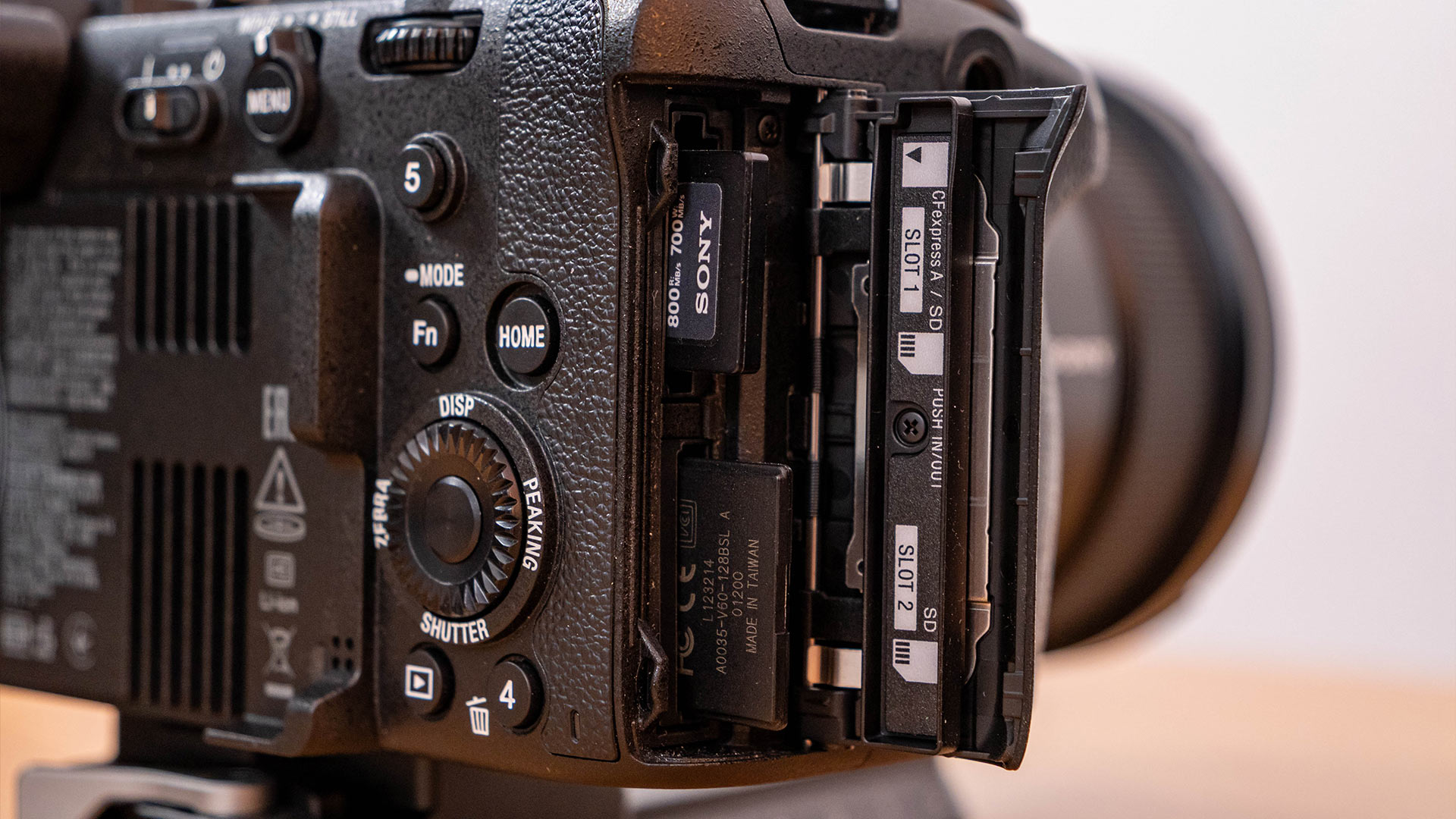 Während der obere Slot sowohl CFexpress Typ A als auch SD-Karten aufnimmt, lassen sich in den unteren Slot nur letztere einschieben.