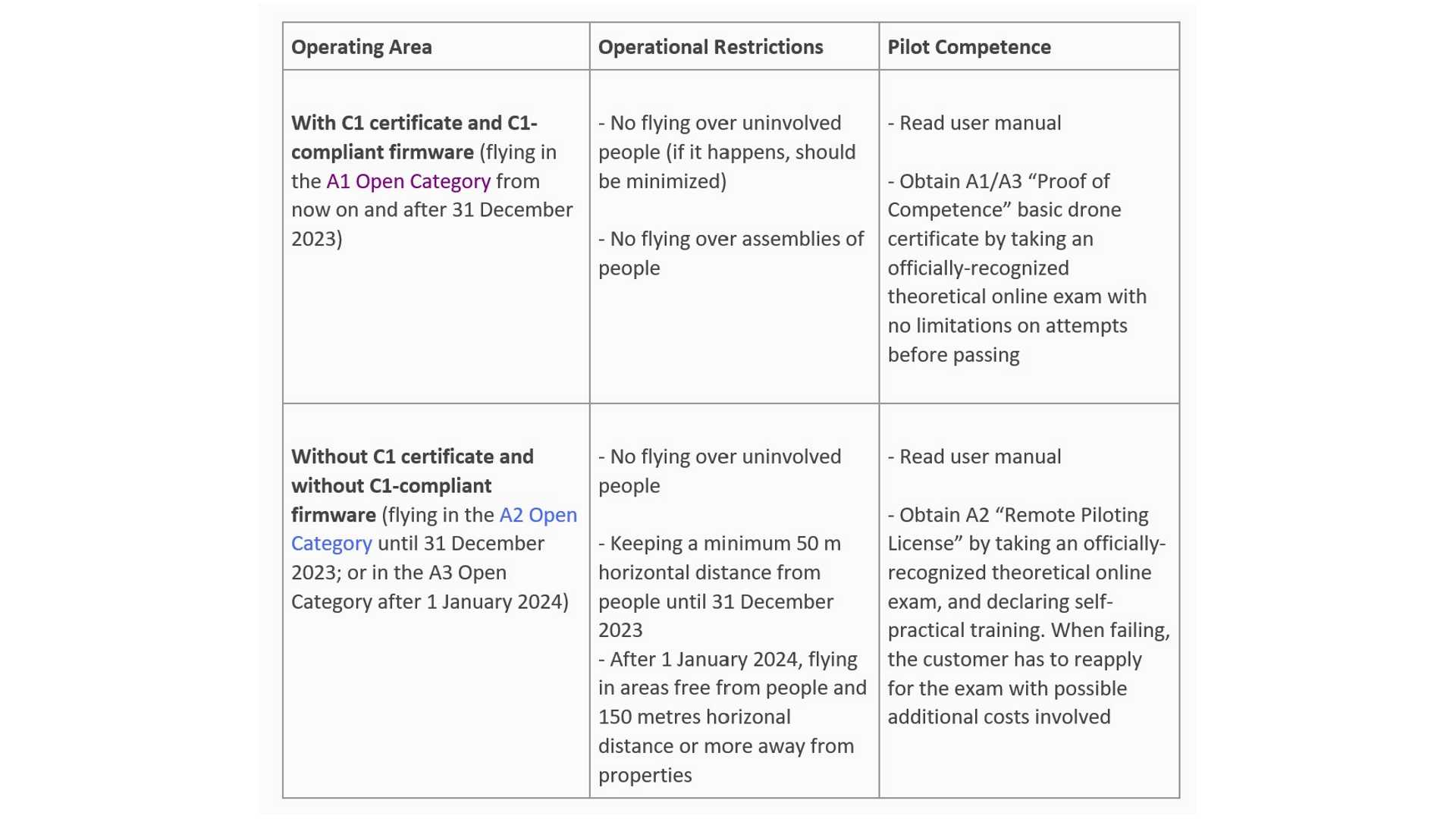 Dieses Zertifikat ist Teil der neuen EU-Drohnen-Regulierung und gilt für Drohnen der „offenen Kategorie“, bedeutet, die Drohne wiegt unter 25 Kilogramm, fliegt nicht höher als 120 Meter und darf nicht direkt über Menschen geflogen werden. Mit dem C1-Zertifikat darf man dann in der neuen offenen A1-Kategorie („Proof of Competence“) fliegen und somit wird nicht mehr das Ablegen der kostenpflichtigen A2-Prüfung („Remote Piloting License“) erforderlich. Mit der C1-Lizenz darf man dann auch in Umgebungen fliegen, die ohne das C1-Zertifikat nicht erlaubt waren und bekommt deutlich gelockerte Regeln. So muss man etwa nicht mehr den horizontalen Abstand von mindestens 50 Meter zu Personen einhalten, sondern darf nur nicht direkt über Menschenansammlungen und „nicht involvierte“ Personen fliegen. Das gilt ab sofort und über den 31. Dezember 2023 hinaus.