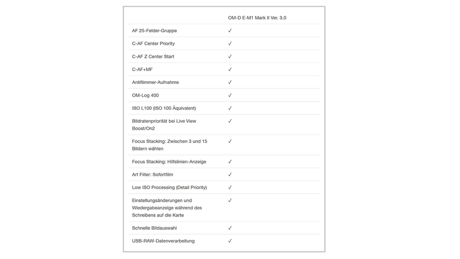 Außerdem wird nun die USB-RAW-Datenverarbeitung für eine schnellere RAW- Verarbeitung mit der Olympus Workspace-Bildbearbeitungssoftware unterstüzt. Die komplette Liste der Verbesserungen hat Olympus in der rechts von uns eingestellten Tabelle aufgelistet. Die neue Firmware 3.0 für die OM-D E-M1 Mark II ist ab sofort verfügbar.