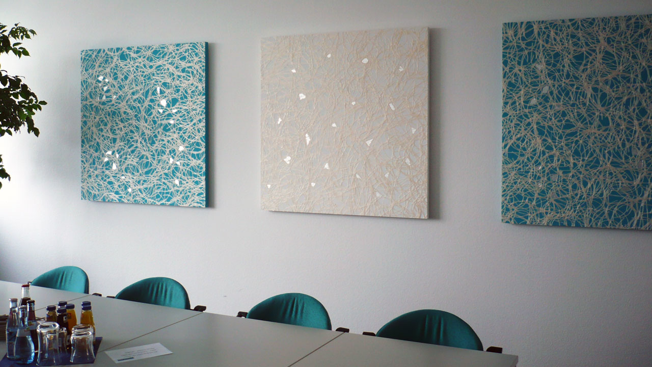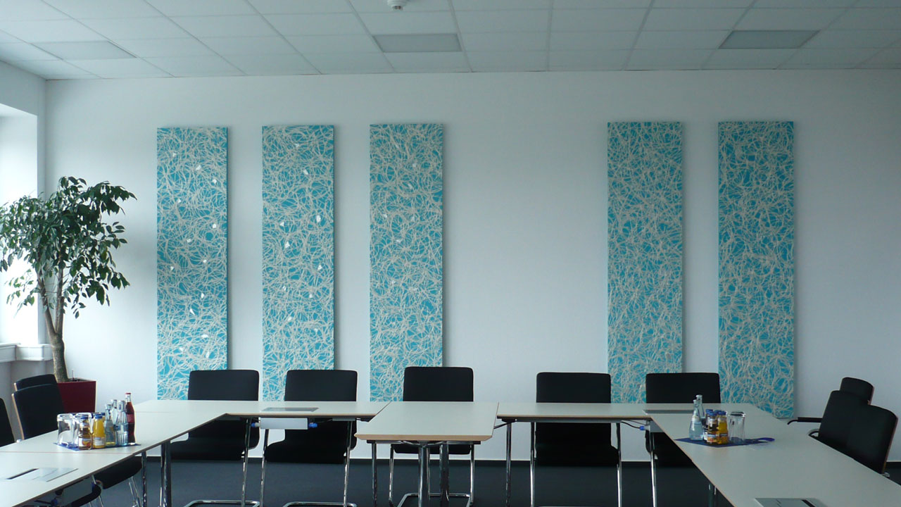 Um Schallreflektionen zu verringern und es im Raum merklich leiser werden zu lassen, sind großformatige Schallabsorber-Bilder oder -Objekte eine Lösung. Die Bilder und Raumskulpturen von BergerLine nehmen Schall auf und reduzieren den lästigen Nachhall im Raum deutlich. Gleichzeitig sind sie als Kunstwerke individuell angefertigte Unikate, die Räumen ein besonderes Flair verleihen. In besonders großen und hohen Räumen ist neben den Wänden auch die Decke als Reflektionsfläche für den Schall relevant. In solchen Fällen kreiert BergerLine Skulpturen aus mehreren Einzelelementen, die unter der Decke zu schweben scheinen. Kombiniert mit LED-Leuchten werden sie zum unverwechselbaren Licht-Objekt. Für Kunden, die mit farbigen Licht-Effekten spielen möchten, integriert BergerLine Lichttechnik, die – vom Tablet-Computer aus angesteuert – wahlweise auch in rot, blau oder grün erstrahlt.