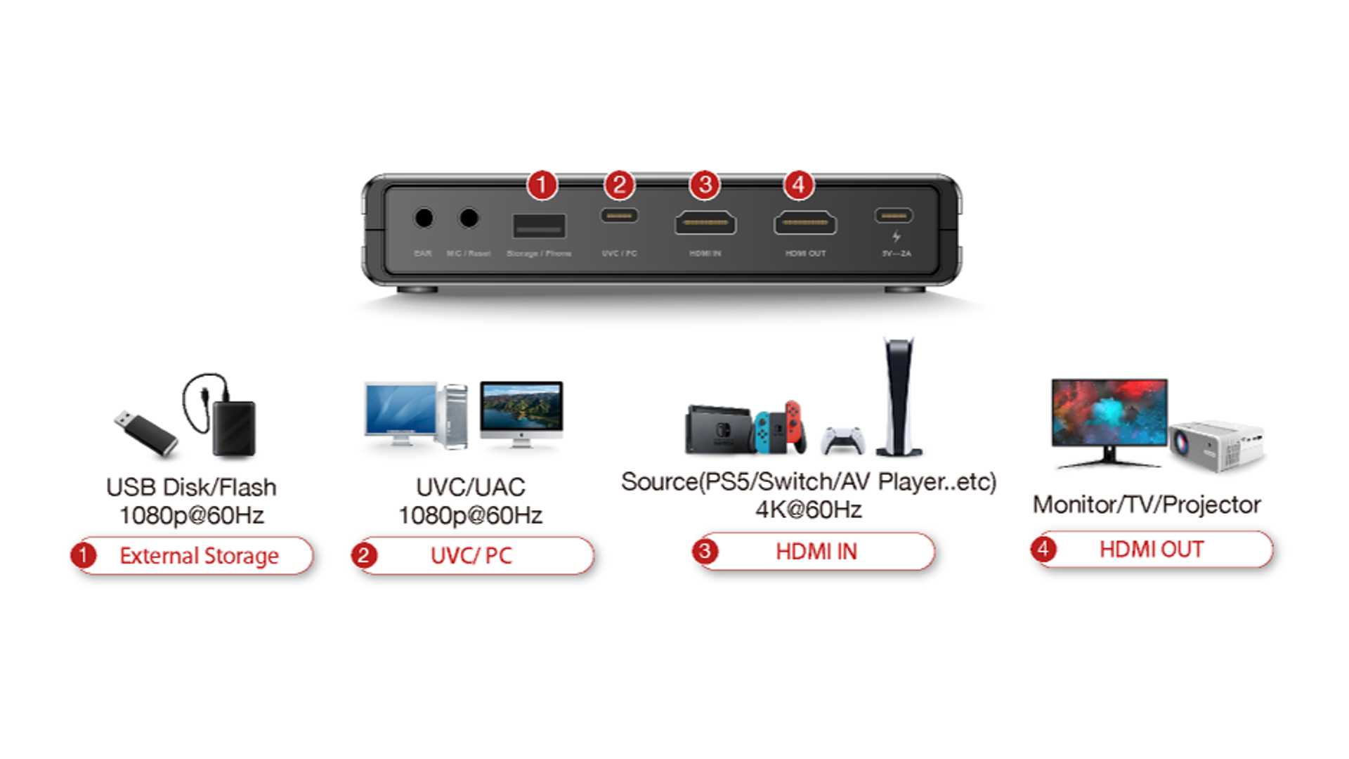 Die EZCast CatchU bietet einen HDMI-Ein- und Ausgang zum Durchschleifen des Videosignal für bis zu 4K 60p sowie zwei Audio-Buchsen und einen USB-Anschluss für externe Speichermedien.