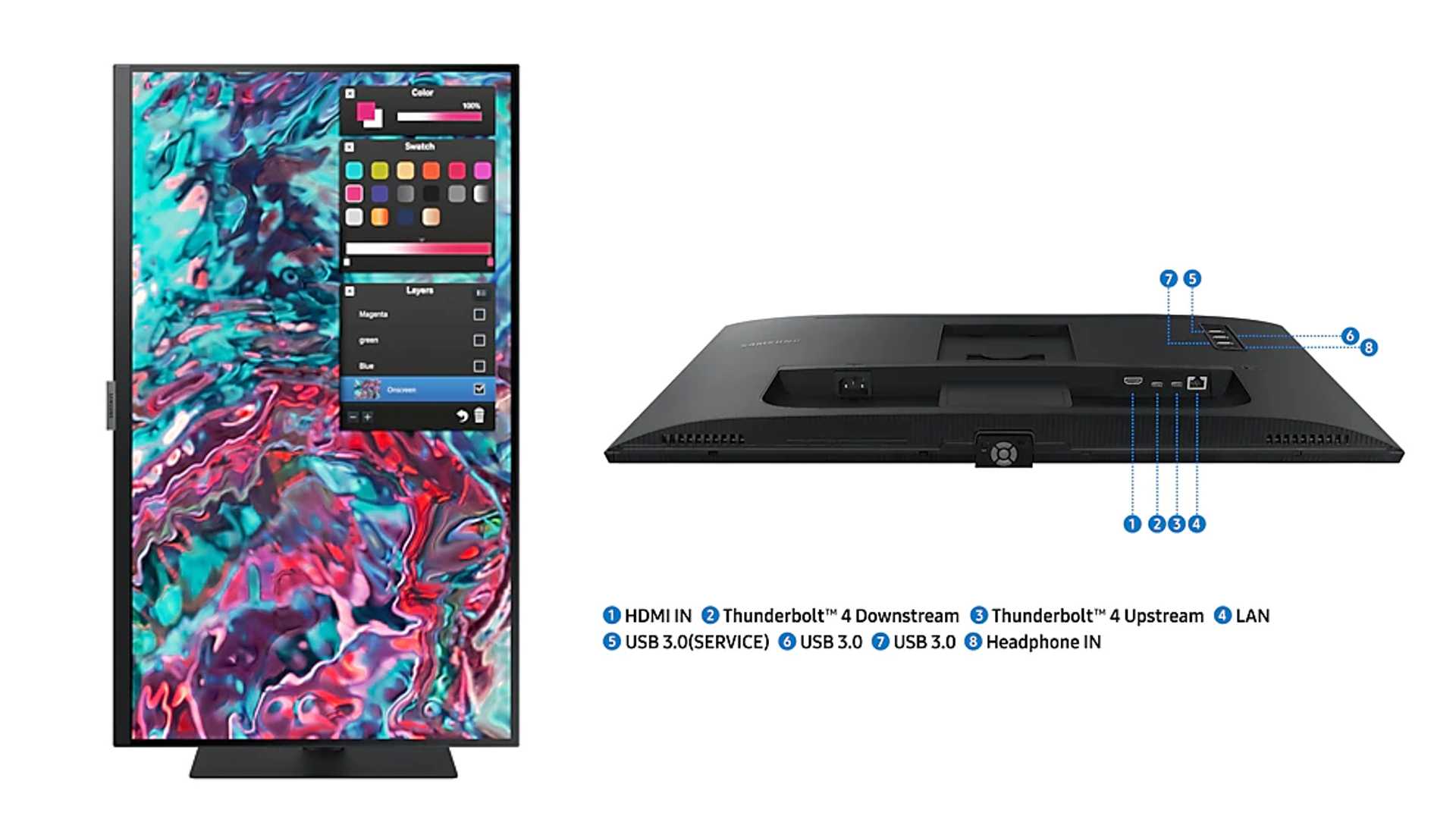 Der Samsung ViewFinity S8UT lässt sich in Pivot-Stellung bringen und offeriert unter anderem Anschlüsse für HDMI sowie zweimal Thunderbolt 4.
