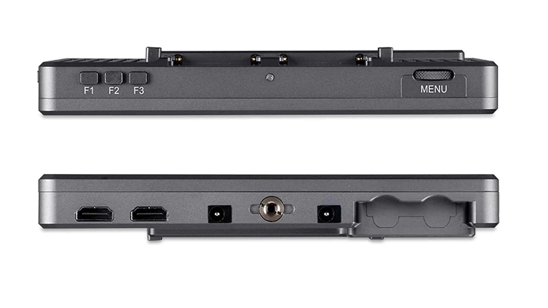 Der Feelworld lässt sich neben dem Touch-Display auch mittels Tasten und Auswahlrad bedienen. Es gibt einen HDMI-Ein- und Ausgang sowie diverse 1/4-Zoll-20-Gewindebohrungen für die Montage auf einem Stativ oder im Kamera-Rig.