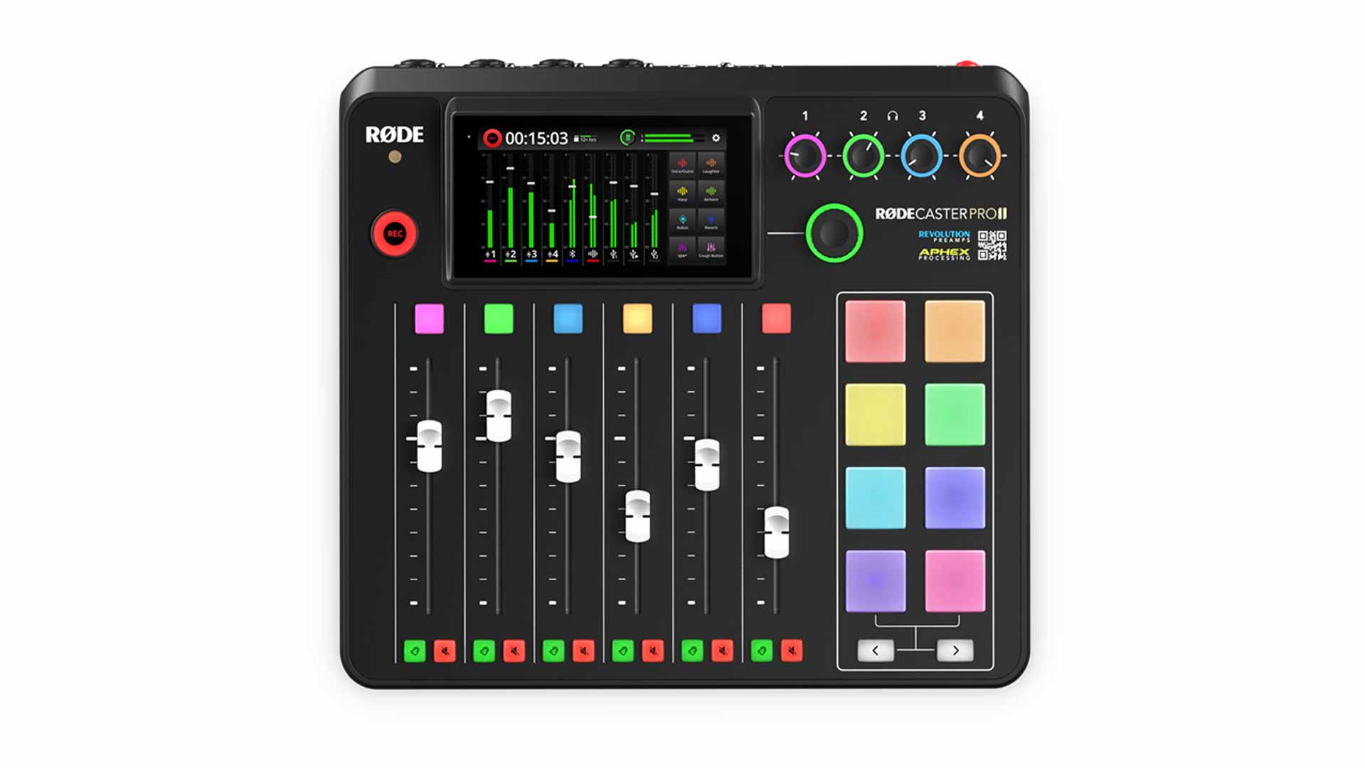 In der Konsole arbeiten Revolution Preamps, die der Hersteller mit sehr niedrigem Rauschen und eine hohe Verstärkung von 76 dB anpreist. Neben dem APHEX Audio Processing, wie dem APHEX Exciter, Big Bottom, Compellor, De-Esser, Noise Gate, Hochpassfilter und Equalizer, können On-Board-Effekte wie Reverb, Delay, Pitch-Shifting und Robot- Voice genutzt werden. Es gibt neun frei konfigurierbare Eingangskanäle – sechs physische und drei virtuelle – die vom Anwender individuell mit den gewünschten Signalen belegt werden können. Darüber hinaus sind acht programmierbare SMART Pads mit acht Bänken für Musik, Samples, MIDI-Befehle, Mixer-Funktionen und Vision Switching sowie ein vier GB großer interner Audiospeicher verfügbar.