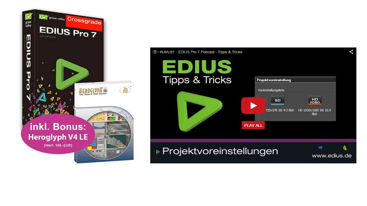 Das seit längerer Zeit geltende Crossgrade-Anbgebot beim Umstieg von einer anderen Schnittsoftware auf Edius 7 gilt nur noch bis Ende März. Ebenfalls bekommt man bis dahin Heroglyph V4 LE von ProdDad als Bonus mit dazu.