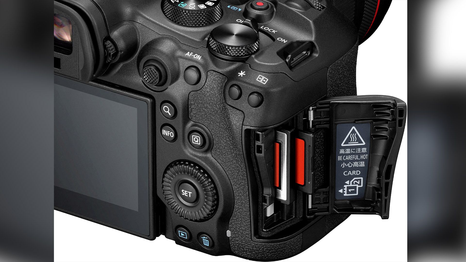 Im Gegensatz zur C50 ist der Sensor der R6 jedoch beweglich gelagert, wobei die optische Stabilisierung bis zu 8,5 Blendenstufen in der Bildmitte und bis zu 7,5 Blendenstufen am Bildrand kompensieren soll. Wo die R6 Mark II noch zwei SD-Kartenschächte besaß, speichert das Nachfolgemodell aufgrund der hohen Datenraten auf eine CFexpress Typ B-Karte, während der verbliebende SD-Kartenslot für Proxy- und Backup-Aufnahmen dient. Eine gleichzeitige Aufnahme datenintensiver Formate auf beide Karten für mehr Speicher ist nicht möglich. Sucher und Display sind von der Mark II übernommen und bieten dieselbe Auflösung mit 1.280 x 960 Pixeln beim Sucher und 900 x 600 Pixeln beim 3-Zoll-Display (7,6 cm).