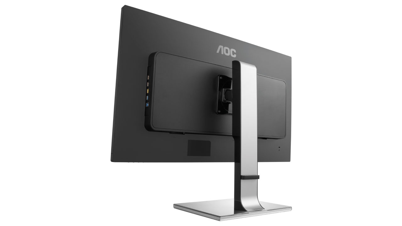 Die Anschlussleiste offeriert jeweils einen DVI-, DisplayPort-, HDMI- und VGA-Port. Die MHL-fähige HDMI-Buchse ist ebenfalls für UHD mit 50/60p gerüstet. In puncto USB bekommt man viermal USB 2.0 sowie eine USB 3.0-Schnittstelle. Der Monitor lässt sich um 18 Zentimeter in der Höhe verstellen, sowie neigen, kippen und drehen – auch wenn AOC hier keine genauen Angaben macht. Pivot, mit 90 Grad-Drehung des Displays, ist aber ebenfalls möglich.