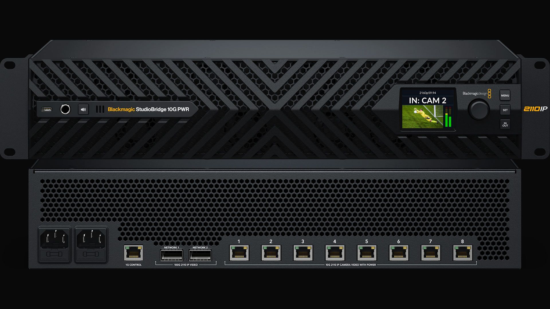 Auf der Kameraseite stattet Blackmagic Design ihre URSA-Kameras mit 100G-Anschlüssen aus. Konkret sind das die URSA Cine 12K 65 und die URSA Cine Immersive 100G, die nun auf dem rückseitigen Anschlusspanel einen 100G-Ethernet-Port besitzen. Zwei dieser Kamerasignale auf einer Höheneinheit nimmt die StudioBridge 100G (2.665 Euro) auf und dient dabei ebenso wie das Schwestermodell StudioBridge 10G PWR (2.665 Euro) als bidirektionaler SMPTE-2110-Konverter. Die StudioBridge 10G PWR offeriert 10G-Einbindung über acht 10G-Ethernet-Anschlüsse mit 90 W-Stromversorgung
