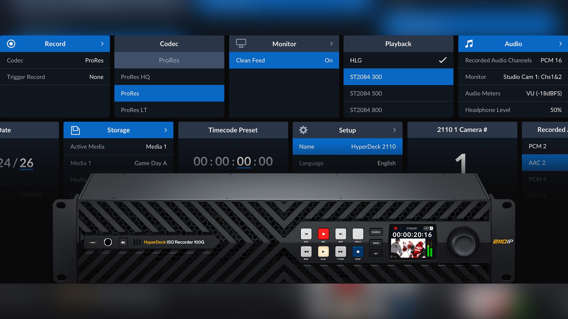 Den Anfang macht der Hyperdeck ISO Recorder 100G, welcher für die Aufnahme von bis zu acht Kameras in ProRes 4K-UHD ausgelegt ist, wobei die ProRes-Codes 422 HQ, 422 und 422 LT unterstützt werden. Er besitzt zwei 100G-Ethernet-Anschlüsse, so dass man die Signale über einen einzigen Eingang einspielen kann. Durch die beiden Anschlüsse ist Redundanz gewährleistet, sodass immer ein Signal aufgezeichnet werden soll. Weitere Redundanz garantieren doppelte Konnektoren für Strom (Kaltgeräte), 2110 PTP Clock und 10G Control (Ethernet) sowie 100G 2110 IP Video (100G-Ethernet). Desweiteren sind Anschlüsse für Management, Fernbedienung und den Monitor an Bord. Der Preis liegt bei 5.149 Euro, ein Marktstart ist gemeinsam mit den anderen Produkten für den Juni geplant.
