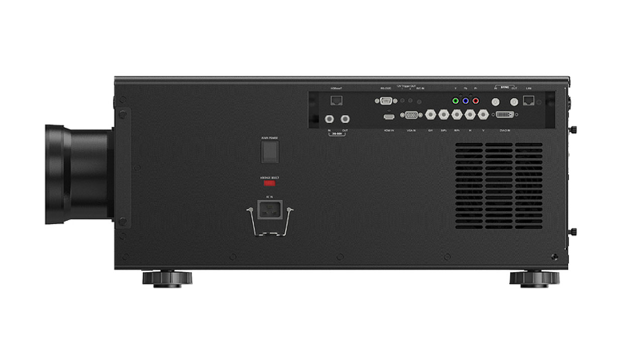 Wie bei Event-Projektoren üblich fällt die Anschlussleiste sehr üppig aus: Unter anderem stehen eine HDMI-, DVI-D-, VGA- und fünf BNC-Buchsen (für Component RGB, Y, Cb / Pb, Cr / Pr) bereit.