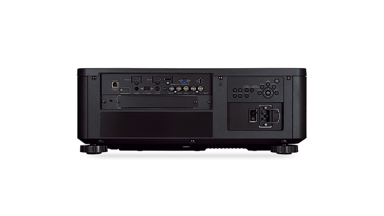Als native Auflösung stellt er 1920 x 1200 Pixel, also WUXGA im 16:10-Format bereit – kommt aber mit Auflösungen bis 4096 x 2160 Pixeln zurecht. Das Kontrastverhältnis liegt bei 10.000:1. Da für Installationszwecke gedacht, bietet der NEC fünf BNC-Anschlüsse für RGB per Component und S-Video, sowie mini-D-SUB, DisplayPort, HDMI und RS232 als Eingänge. Ein HDMI-Port dient zudem als Ausgang. Ferner lässt er sich per RJ45-Buchse ins Netzwerk einbinden.