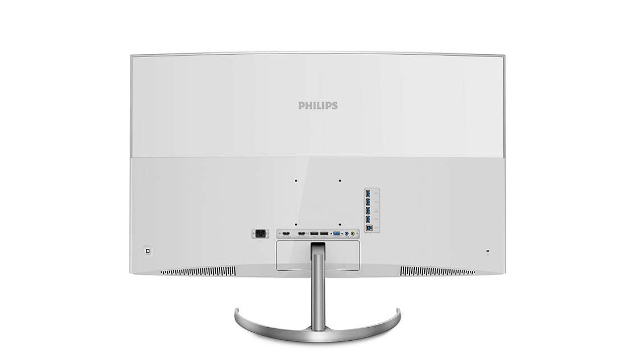 Die Anschlussleiste beherbergt einen VGA-, HDMI 1.4-, HDMI 2.0- sowie zwei DisplayPort-Buchsen. Es stehen zudem gleich vier USB-3.0-Schnittstellen bereit, worüber sich auch Mobilgeräte aufladen lassen. Daneben gibt es einen Audio-Eingang sowie einen Kopfhörer-Anschluss. Anhand der zwei 5-Watt-Lautsprecher gibt der Philips den Ton auch direkt aus. Der Standfuß erlaubt das Neigen des Displays um -5 bis 10 Grad. Drehen und Schwenken lässt es sich offenbar nicht.