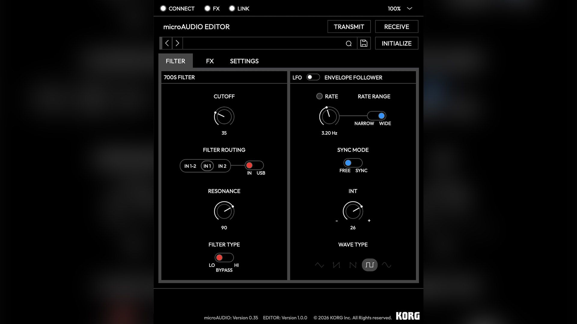 Im Namen und laut Korg auch in der Funktionsweise lehnt sich der Filter an den des Synthesizers 700S an, welcher 1973 auf den Markt kam und nicht nur Korgs (damals noch KEIO) erster Synthesizer überhaupt ist, sondern gemeinsam mit Rolands SH-1000 zu den ersten Synthesizern aus Japan zählt. Der Filter des microAudio 722 soll so besonders warm und musikalisch, sprich in bestem Sinne „retro“ klingen und sich somit wie das gesamte Interface in ein bestehendes DAW-Setup integrieren lassen. Anwendende können zwischen Hoch- oder Tiefpassfilter wählen sowie per Drehregler Cutoff und Resonance einstellen. Auch ein LFO (Low Frequency Oscillator) zum dynamischen Anpassen ist an Bord. Zudem kann man den Filter nicht nur auf das Eingangssignal, sondern auch auf den per USB-C eingehenden Ton legen und somit den Filter unabhängig vom restlichen Interface nutzen. Über die kostenlose Software microAudio Editor können Nutzende nicht nur die Parameter der Interfaces synchron steuern, sondern auch die in die Geräte integrierten Effekte Noise Gate und Kompressor respektive Limiter nutzen. Nicht machbar sind jedoch Aufnahmen mit 32 Bit, maximal 24 Bit und 192 Kilohertz sind möglich.